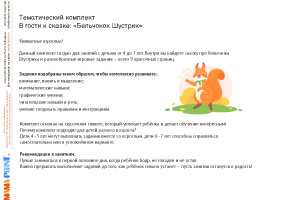 Комплект «Бельчонок Шустрик» — это осеннее тематическое занятие для детей 4–7 лет. В наборе представлена сказка про любознательного бельчонка и игровые рабочие листы, которые помогут ребёнку учиться в увлекательной форме. Материал включает 9 красочных страниц с разнообразными заданиями для развития памяти, речи, мышления, графических и математических навыков.