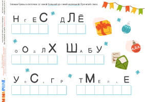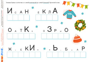 Этот зимний комплект предлагает детям увлекательные задания на анализ букв и чтение. Ребёнок сравнивает буквы по высоте, раскладывает их в нужном порядке и выписывает получившееся слово. Такой формат тренирует внимание к графическим особенностям букв, развивает зрительное восприятие и укрепляет навык чтения.