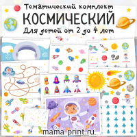 Этот комплект развивающих заданий для детей 3–5 лет содержит около 30 заданий на 28 страницах. В наборе есть шаблоны для вырезания и сборки ракеты и планет, инструкции по изготовлению бумажных звёзд и аппликаций, задания на пластилинографию, раскраски по схемам, тренажёр счёта до 20, лабиринты, зеркальное копирование по клеткам, пазлы из полос и упражнение по сборке МКС. Есть страницы с познавательной информацией о созвездиях, орбитах и спутниках, простые шифровки и задания на последовательности.