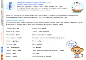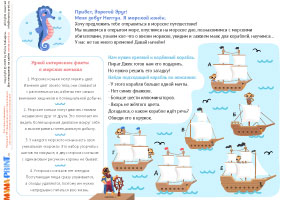 Тематическое занятие для детей 4–7 лет на 12 страницах с примерно 11 рабочими листами и игровыми заданиями. Ребёнок находит подходящий корабль по описанию, знакомится с морской лексикой, работает с семафорной азбукой и азбукой Морзе, тренирует навигацию по сетке, учится вязать морские узлы по пошаговым схемам, расскрашивает рыбу по суммам и выполняет задания на внимание, память и поиск слов. В конце ребёнок получает диплом юнги.