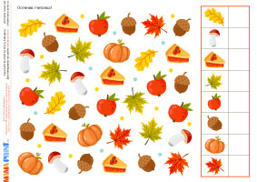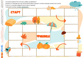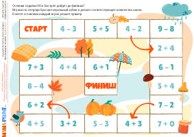 Осенние примеры – это красочный комплект заданий для дошкольников и младших школьников, где ребёнок сможет тренировать устный счёт в пределах 10. В наборе собраны иллюстрированные карточки с примерами на сложение и вычитание, занимательные игровые задания, осенняя считалка и настольная игра-ходилка. Каждое упражнение сопровождается яркими картинками с листьями, грибами, овощами и другими символами осени, что делает обучение интересным и наглядным.