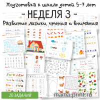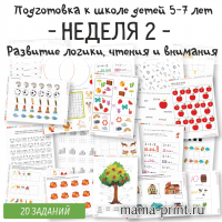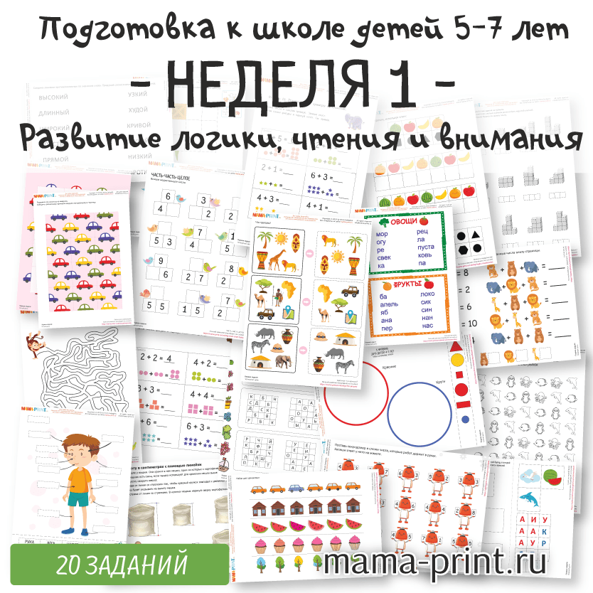 Первая неделя программы подготовки к школе для детей 5–7 лет. В комплект входят 20 разнообразных заданий, направленных на развитие логики, внимания, памяти и навыков чтения. Материалы включают упражнения на состав числа, простые примеры, классификацию, поиск одинаковых предметов, измерения и работу с буквами.