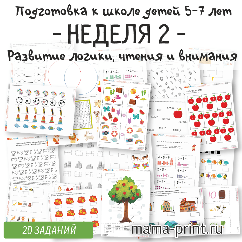 Вторая неделя программы для детей 5–7 лет продолжает развитие базовых учебных навыков. В комплект входят задания на счёт, чтение, логику, пространственное мышление и внимание. Дети учатся ориентироваться в понятиях «лево–право», выполнять простые арифметические действия, решать ребусы, классифицировать фигуры и находить закономерности.